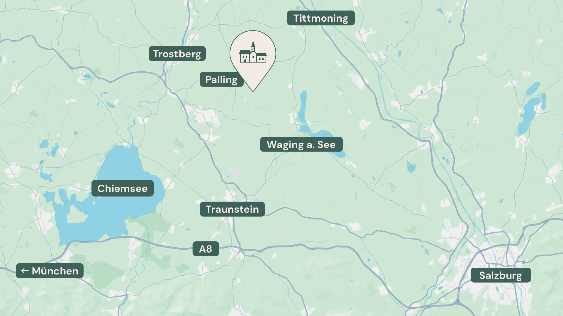 Das Klostergut liegt auf einer Anhöhe südöstlich von Palling im Rupertiwinkel – rund 8 Minuten vom Waginger See entfernt.